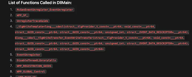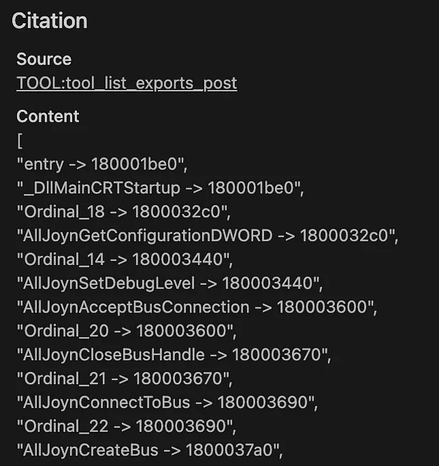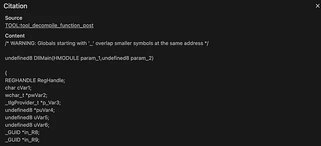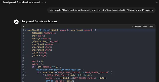 - User Prompt (in OpenWeb-UI): “decompile DllMain and show the result, print the list of functions called in DllMain, show 15 exports”