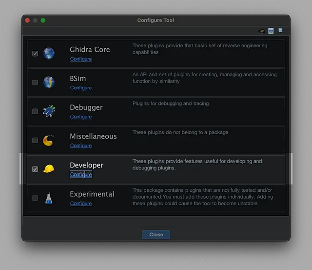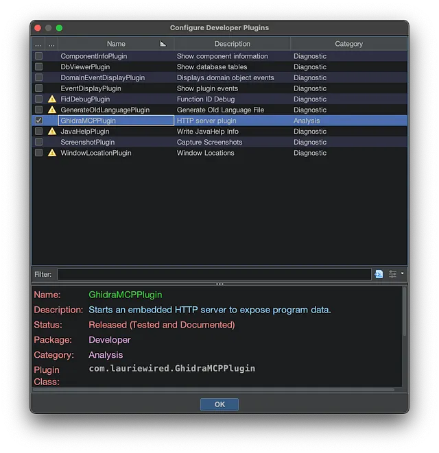 In Ghidra’s CodeBrowser window, go to File -> Configure …, navigate to the ‘Developer’ category in the list on the left, find GhidraMCPPlugin, and ensure its checkbox is enabled.