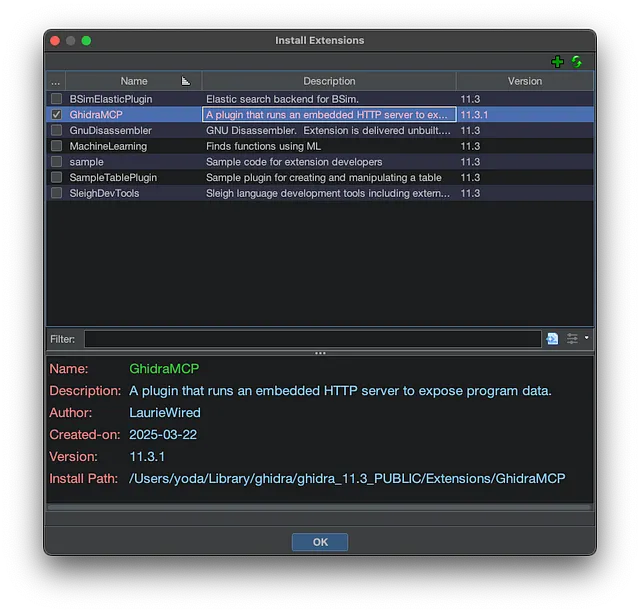 File -> Install Extensions..., click the green+icon, select the downloaded GhidraMCP.zipfile, and click OK. Restart Ghidra.