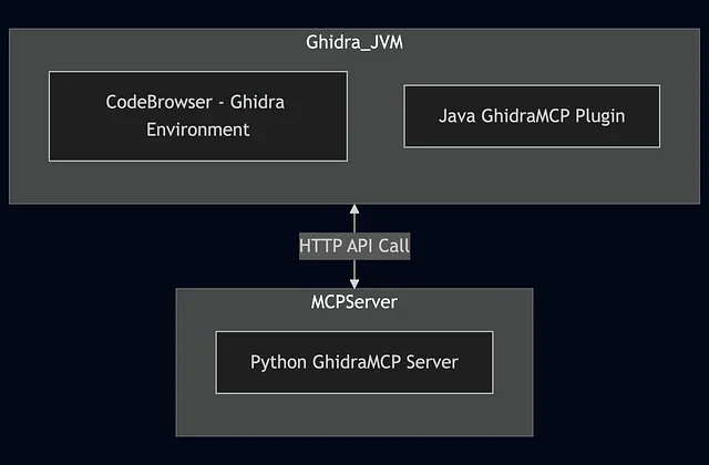 GhidraMCP is an implementation of an MCP server that exposes Ghidra’s core functionalities (like decompiling, renaming, analyzing) as callable “tools” or API endpoints. This means the LLM isn’t just a passive observer; it can actively drive Ghidra to perform actions based on your requests, enabling true automation. There are two primary components, a Java plugin which exposes the Ghidra API, and a Python based MCP server that connects to the Ghidra plugin running in the Ghidra Codebrowser. Currently, the GhidraMCP server provides a direct connection to a single binary, a 1-to-1 relationship.