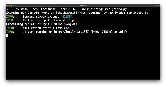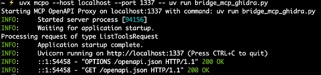 uvx mcpo --host localhost --port 1337 -- uv run bridge_mcp_ghidra.py