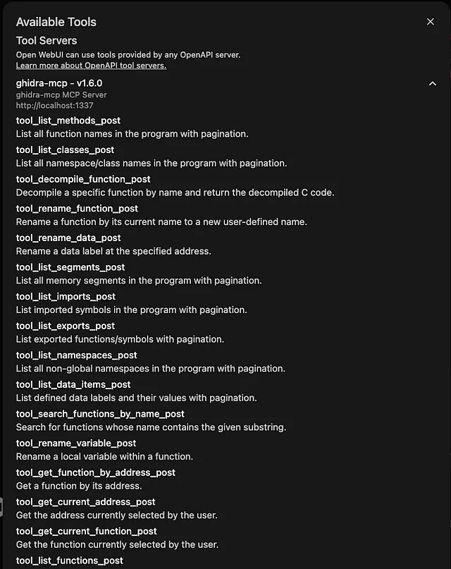 Outcome: You now have a running HTTP server endpoint that LLM clients like OpenWebUI can connect to. This endpoint acts as the gateway to controlling Ghidra via the LLM.