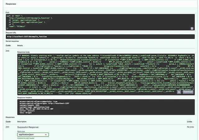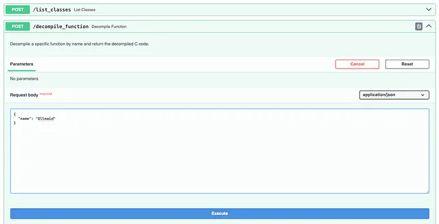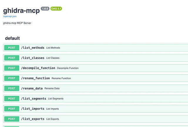 A fantastic feature included courtesy of mcpo is the instant availability instant availability of interactive API documentation for the MCP serve via the Swagger UI interface. With mcpo, GhidraMCP exposes its functions (like decompile_function, get_imports, rename_data, etc.) through a standard REST API that you can debug and test.